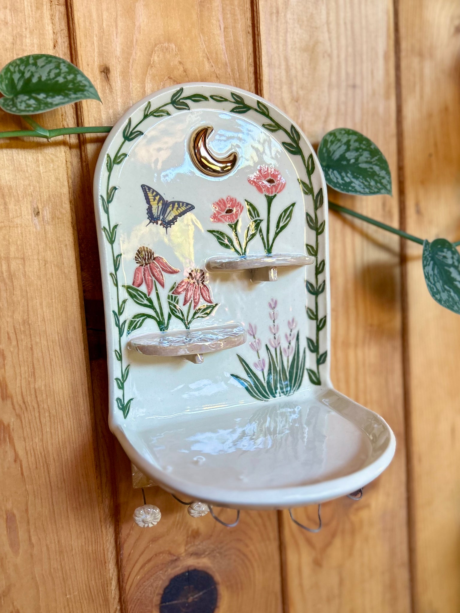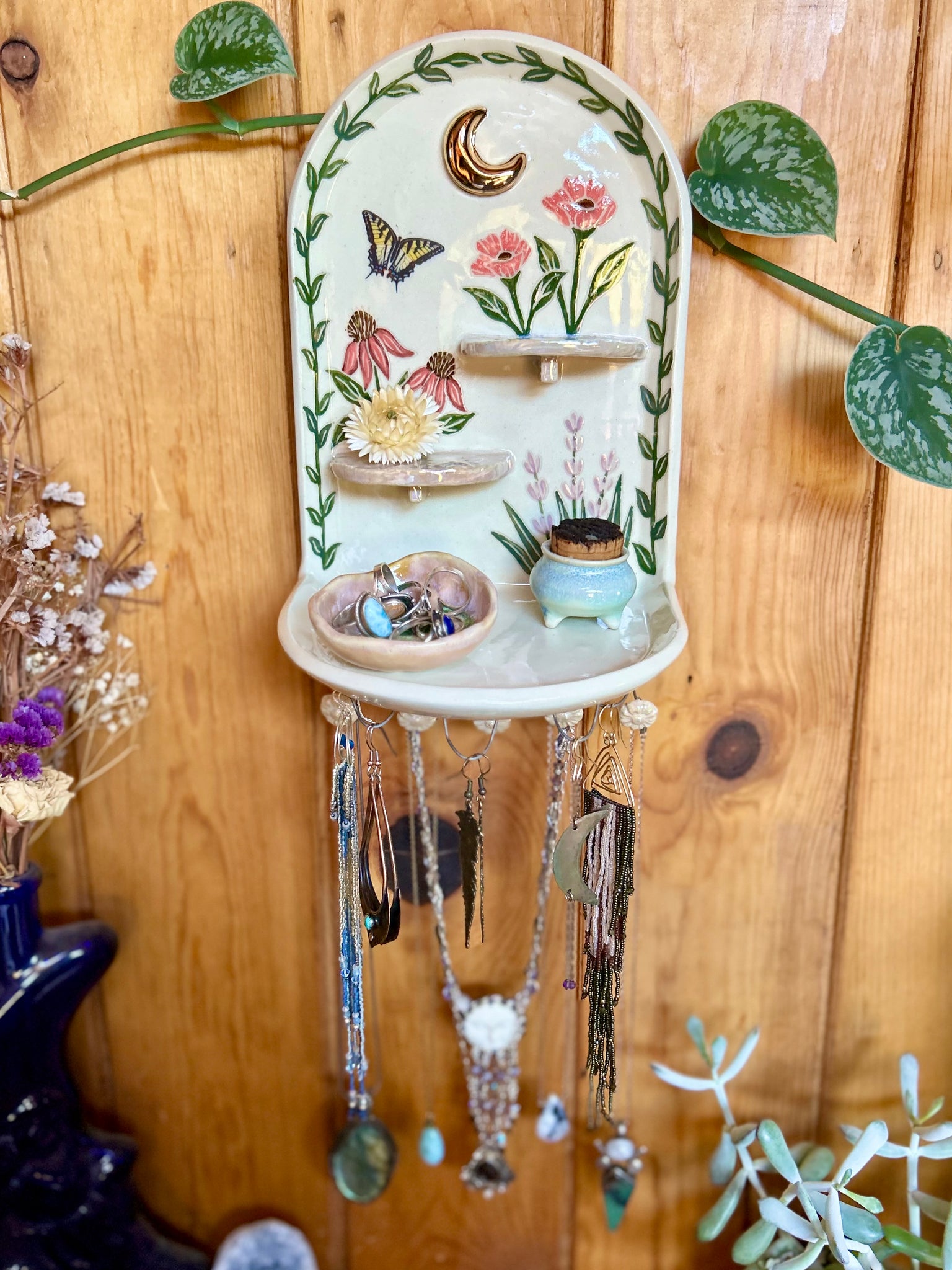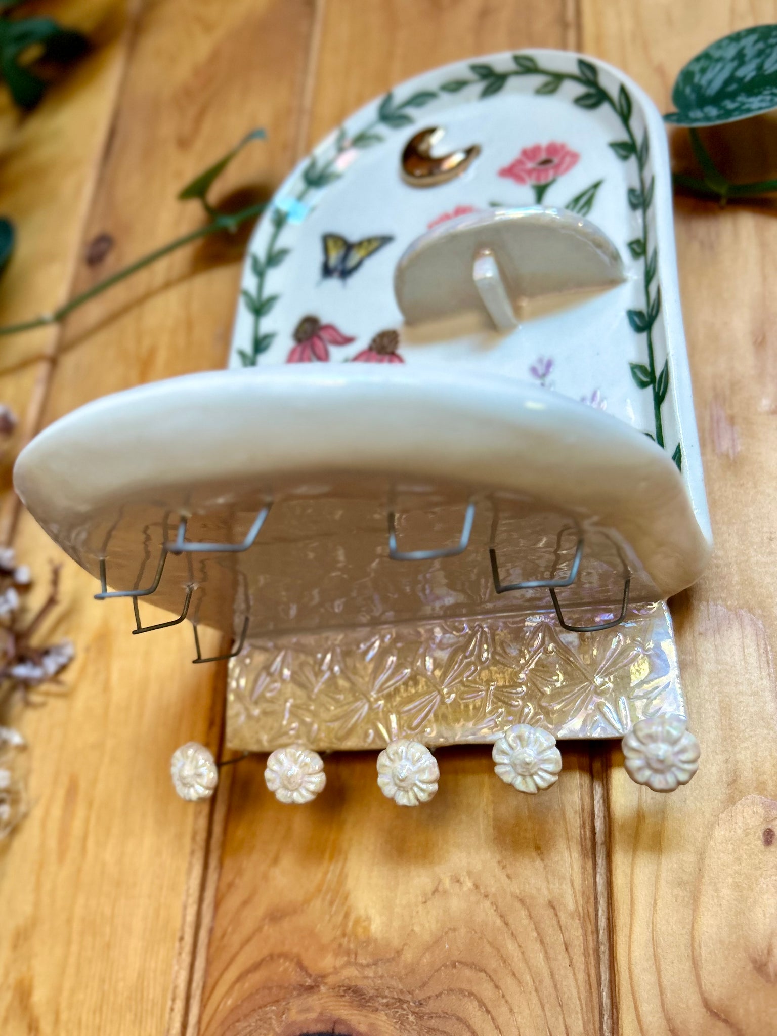 Hand built, painted, and carved large jewelry altar adorned with painted pink poppies, echinacea, and lavender flowers, 22k gold moon, butterfly decal, and mother of pearl finish. This altar is made to store and display your jewelry featuring 5 prongs for necklace hanging, and 7 loops for hanging earrings.