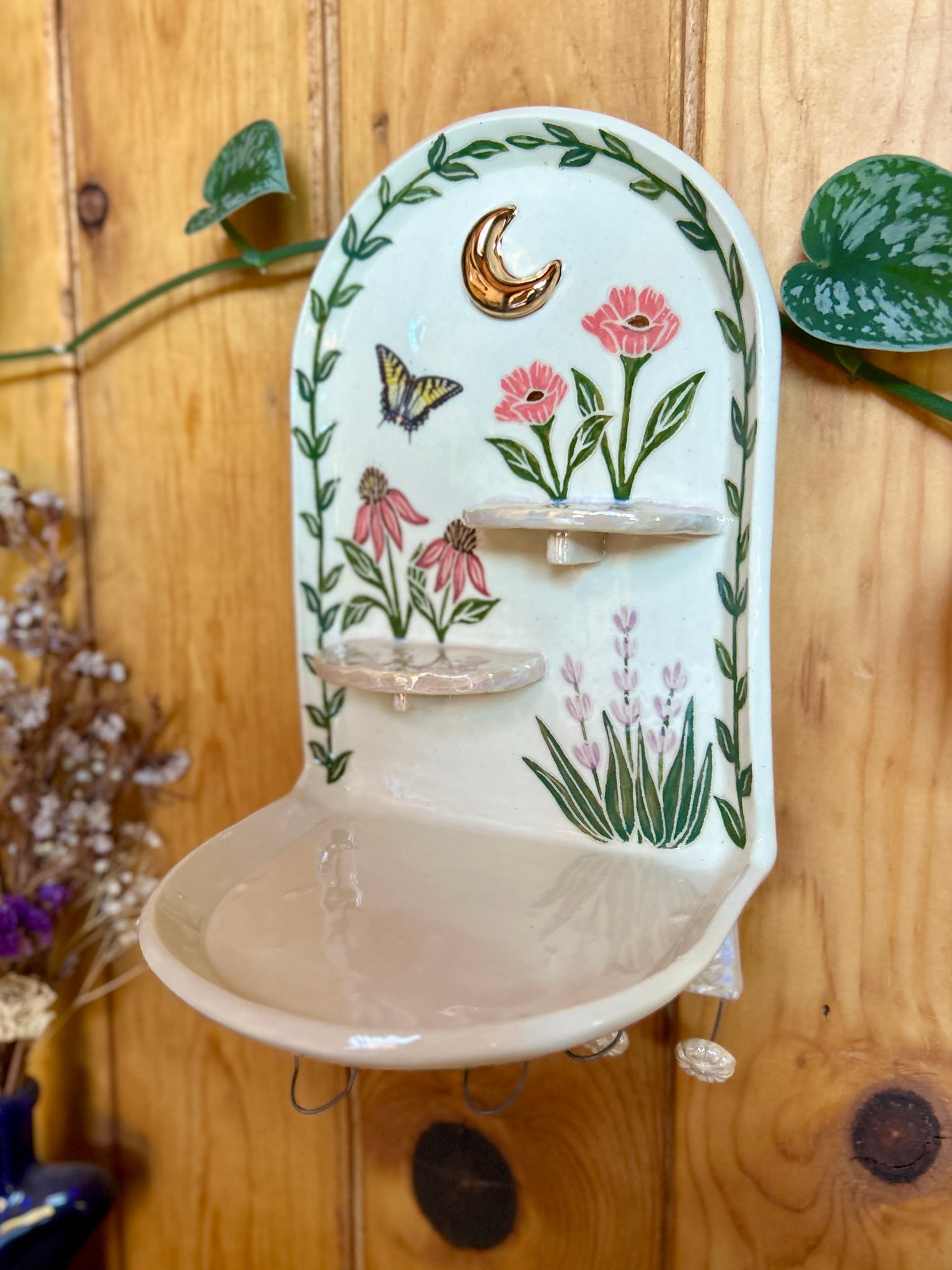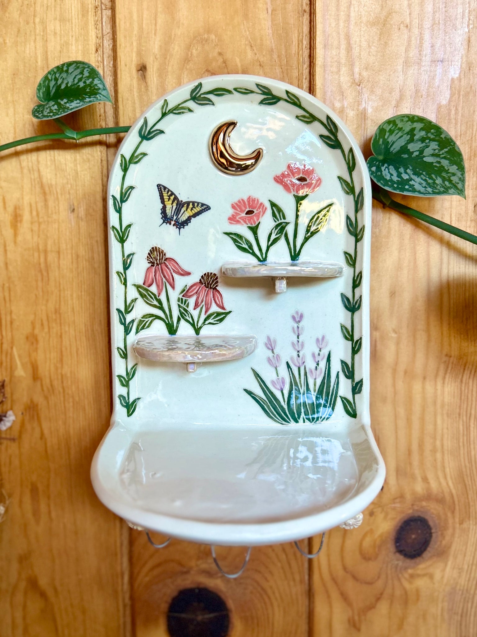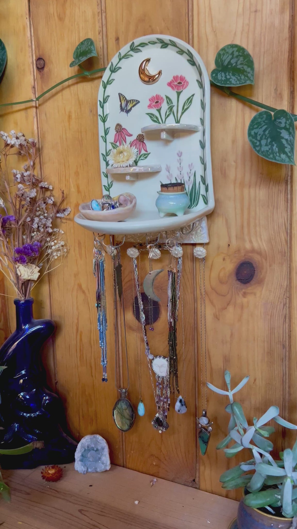 Hand built, painted, and carved large jewelry altar adorned with painted pink poppies, echinacea, and lavender flowers, 22k gold moon, butterfly decal, and mother of pearl finish. This altar is made to store and display your jewelry featuring 5 prongs for necklace hanging, and 7 loops for hanging earrings.