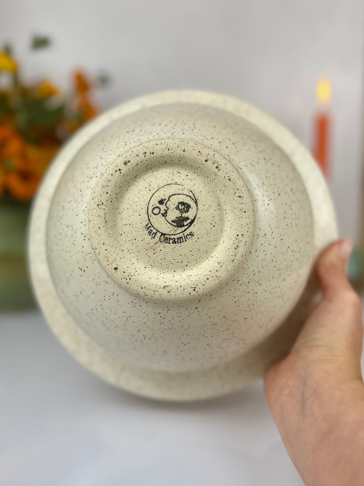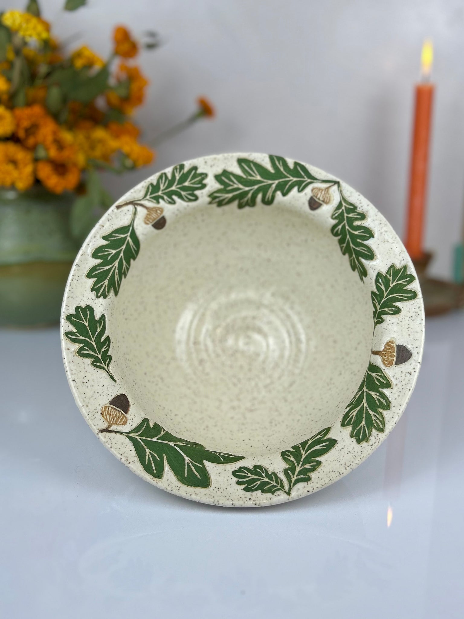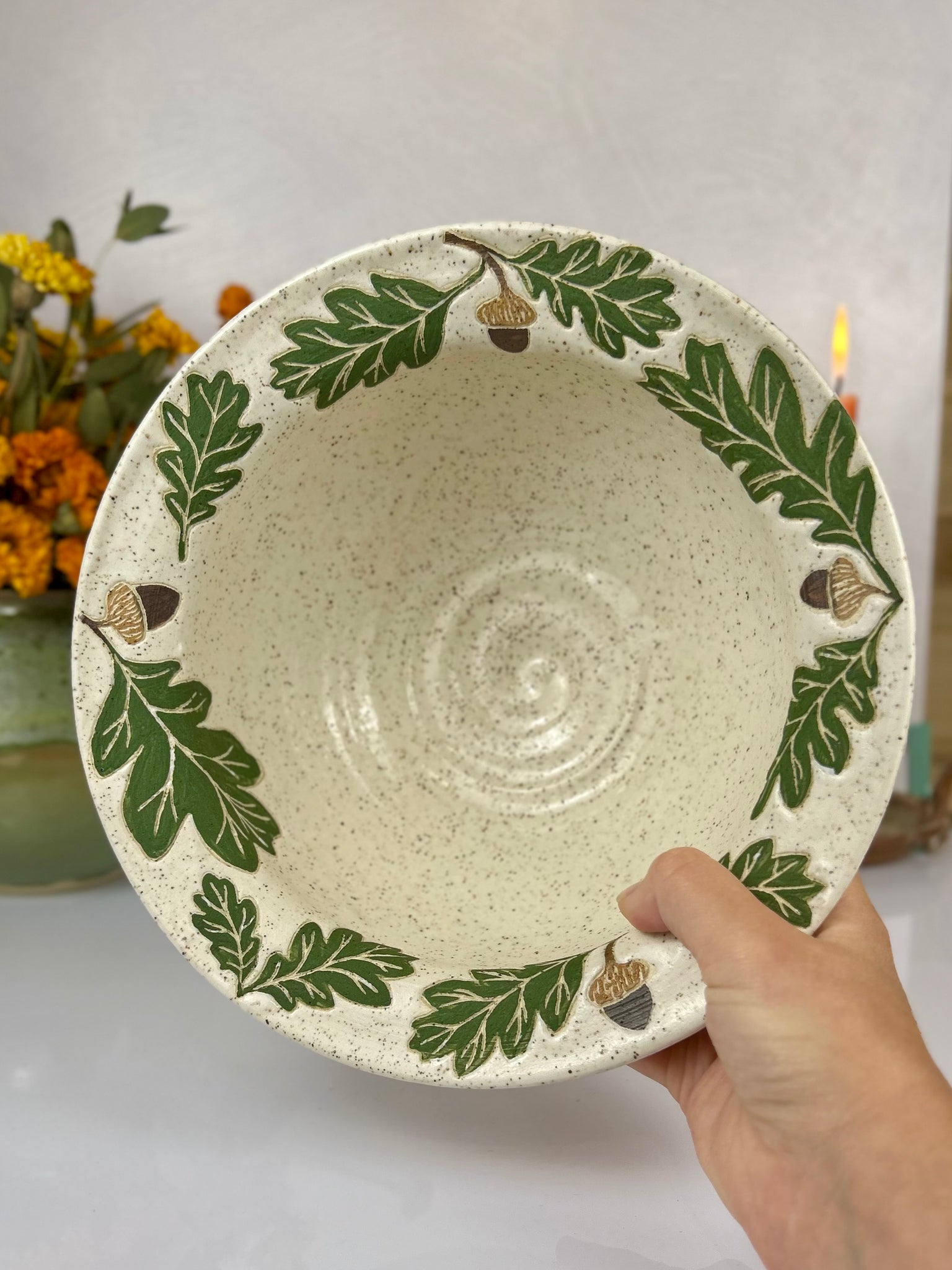 Hand thrown, painted, and carved white oak leaf and acorn serving bowl made with speckled clay and glazed in white.