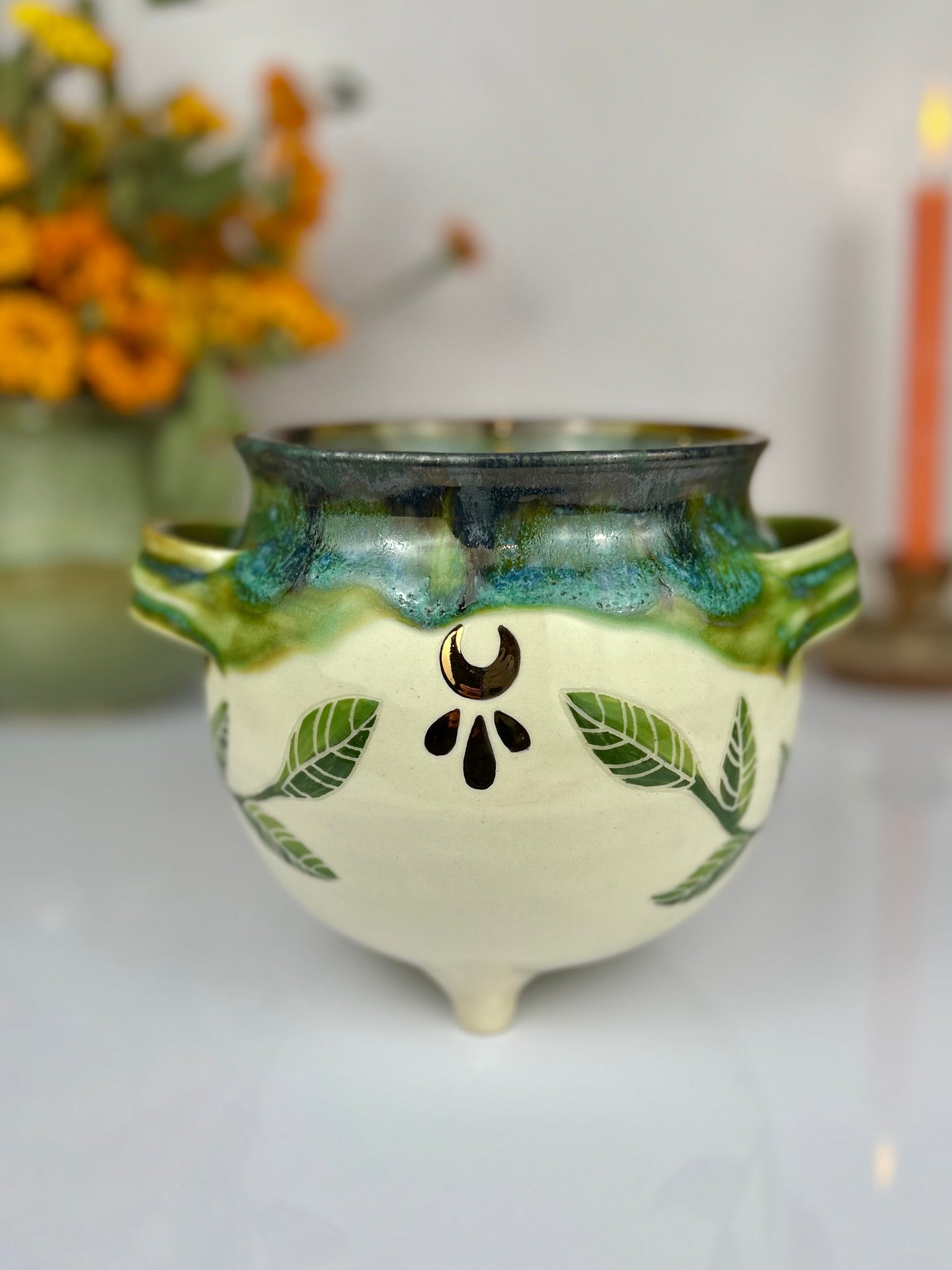 Hand thrown, painted, and carved Luna moth and vine cauldron pot adorned with 22k gold moons and enchanted meadow glaze.