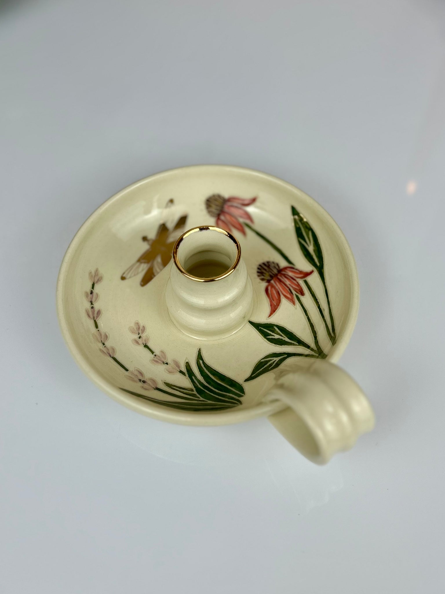 Hand thrown, painted, and carved echinacea and lavender flower candle walker adorned with 22k gold dragonfly decal and gold detailing.