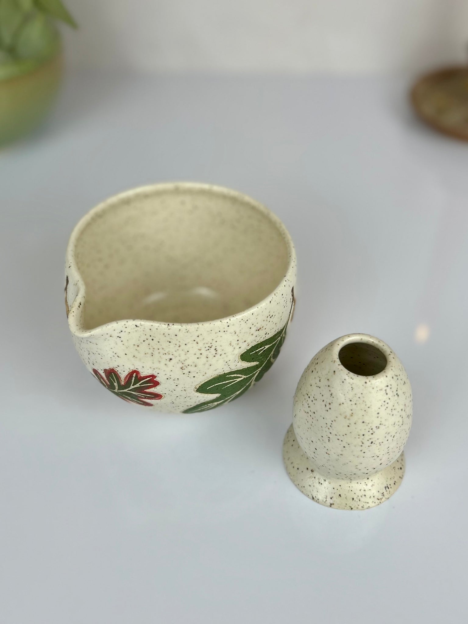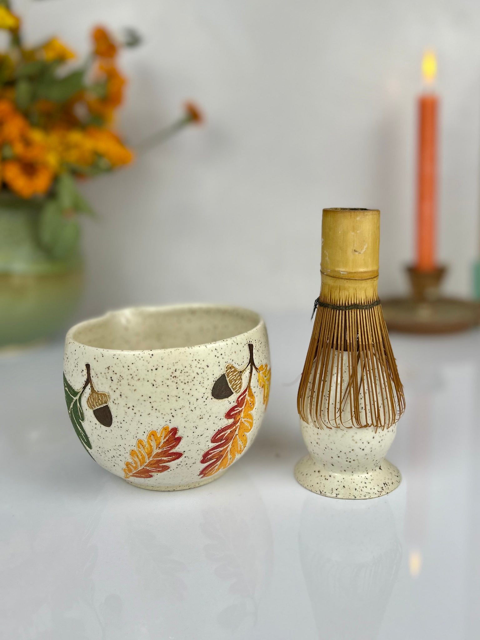 Hand thrown, painted, and carved Autumn oak leaf and acorn matcha bowl made with speckled clay and glazed in white. Comes with matching wisk holder.