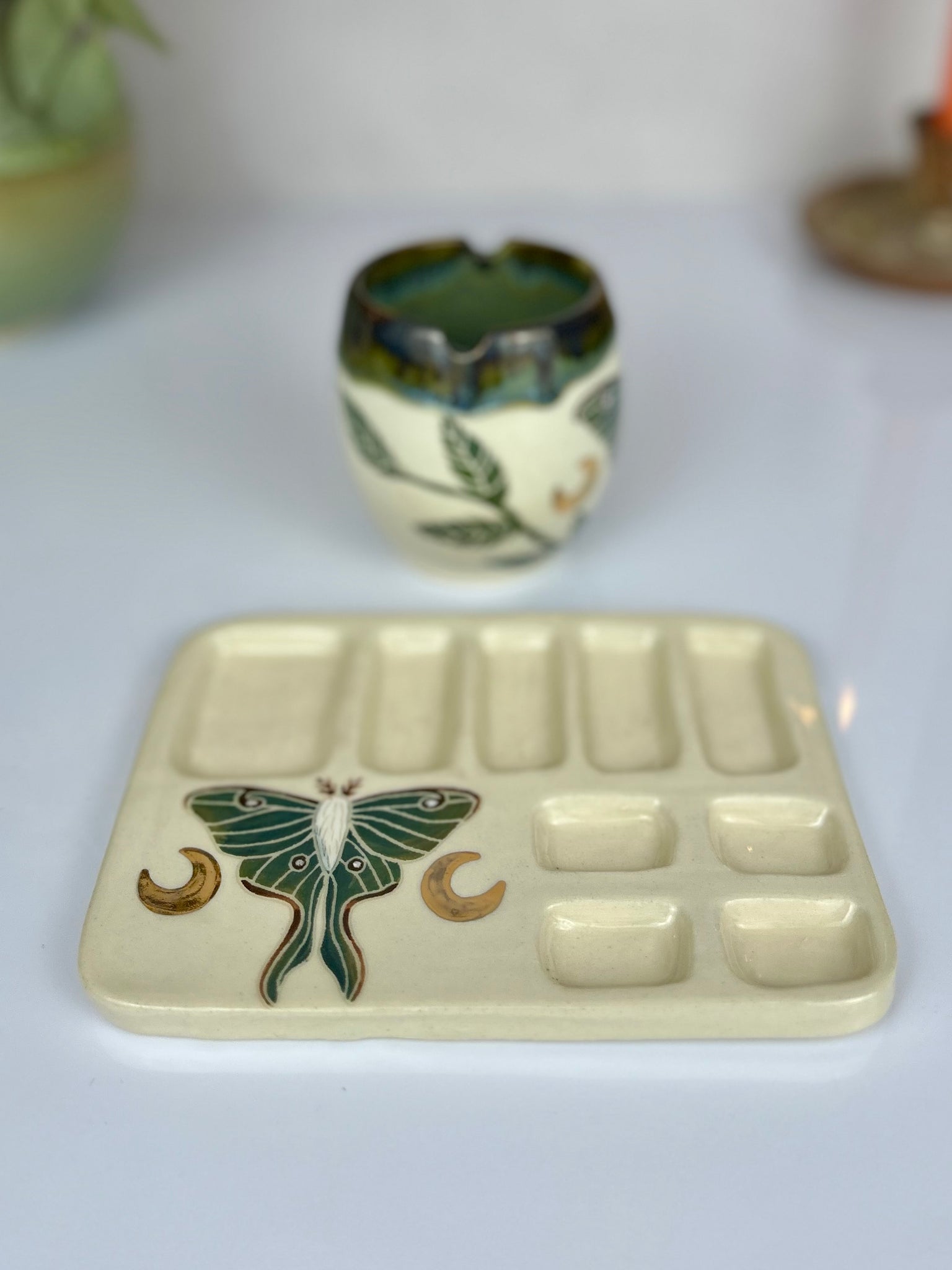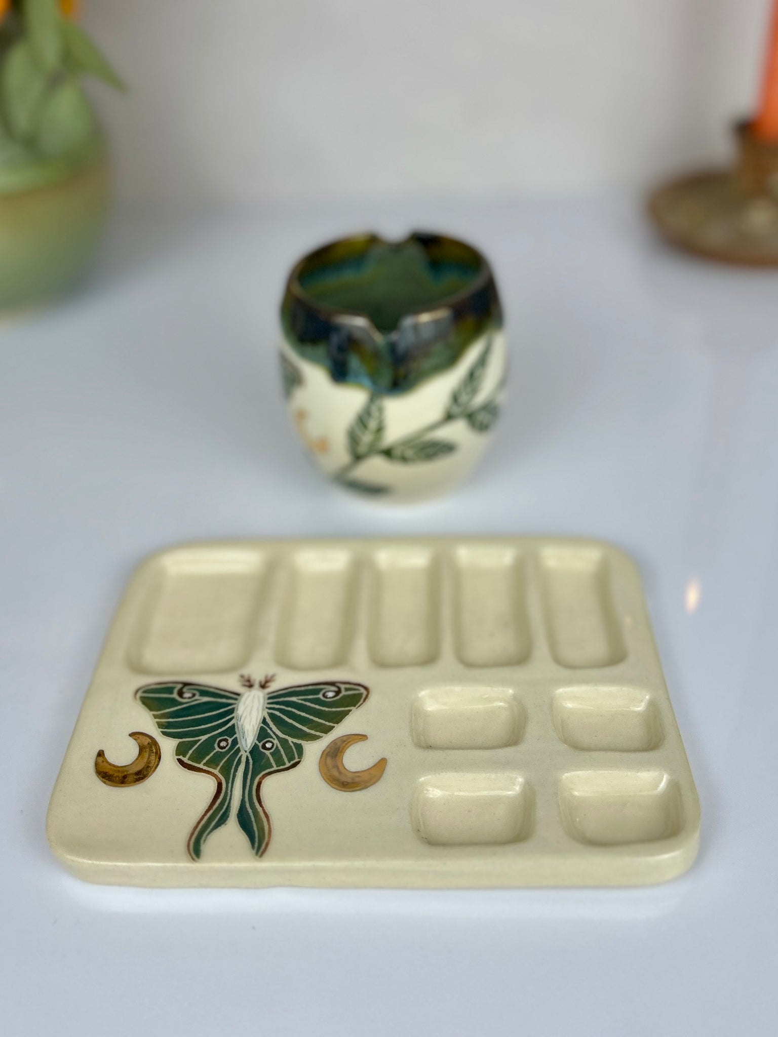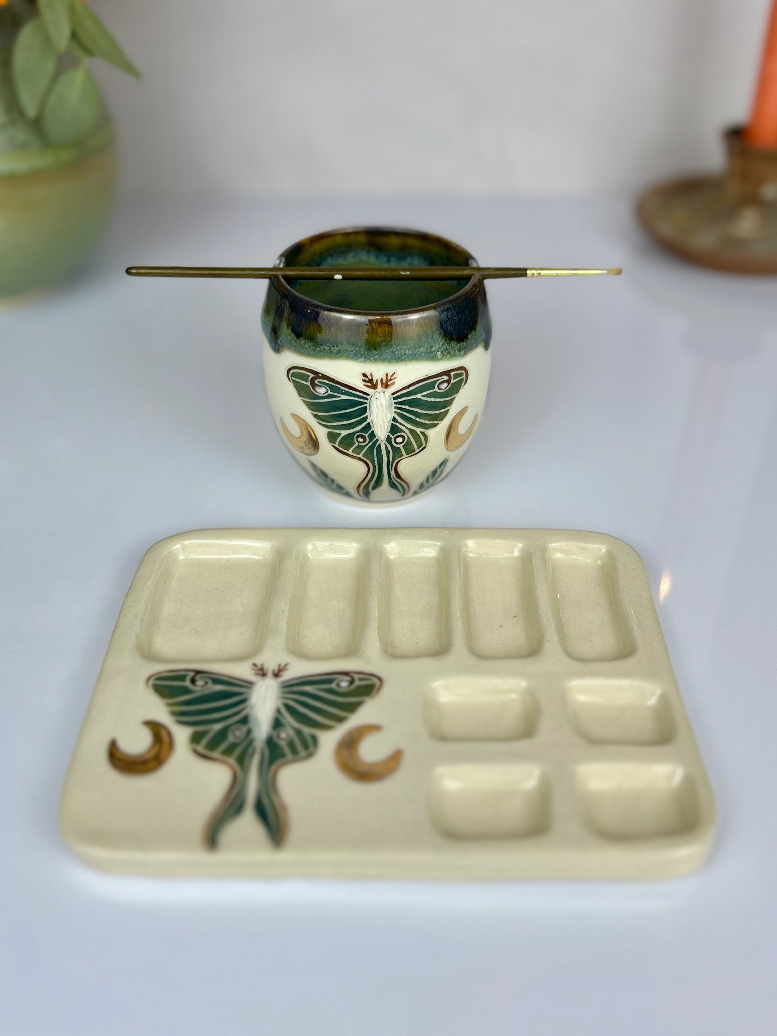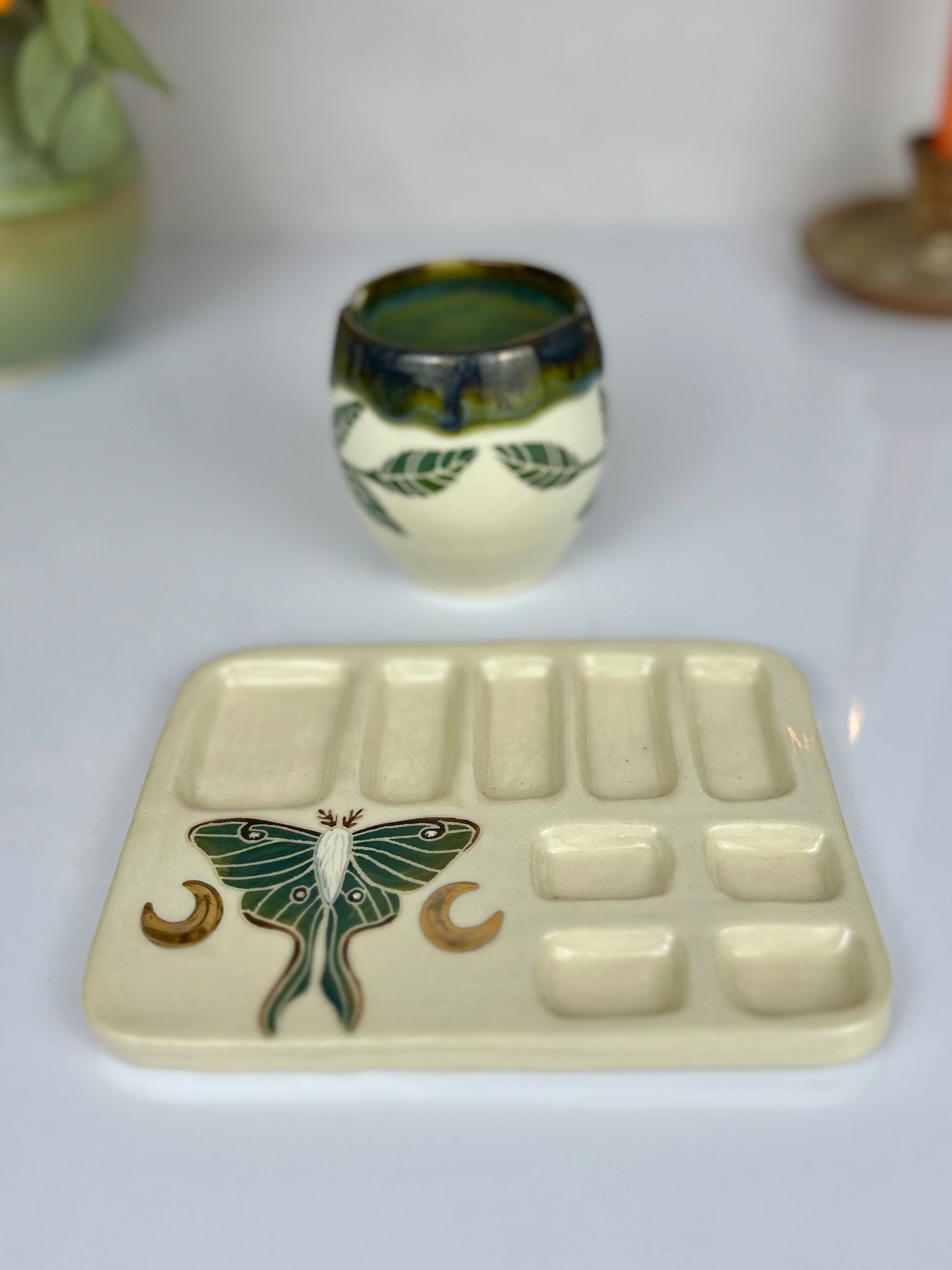 Hand built, painted, and carved luna moth and vine  paint palette and matching water cup adorned with 22k gold moons.