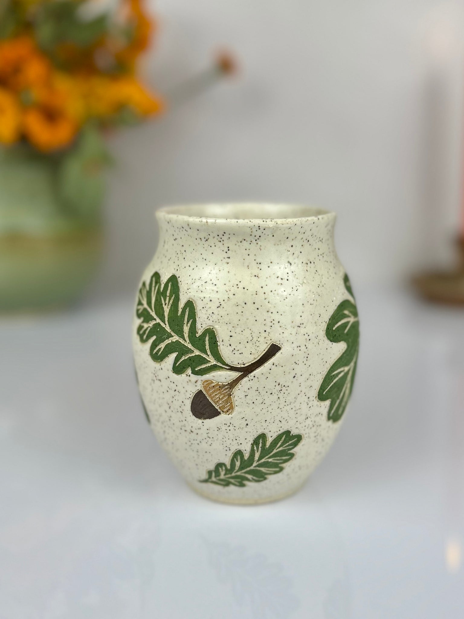 And thrown, painted, and carved summer oak and acorn mug made with speckled clay and glazed in white