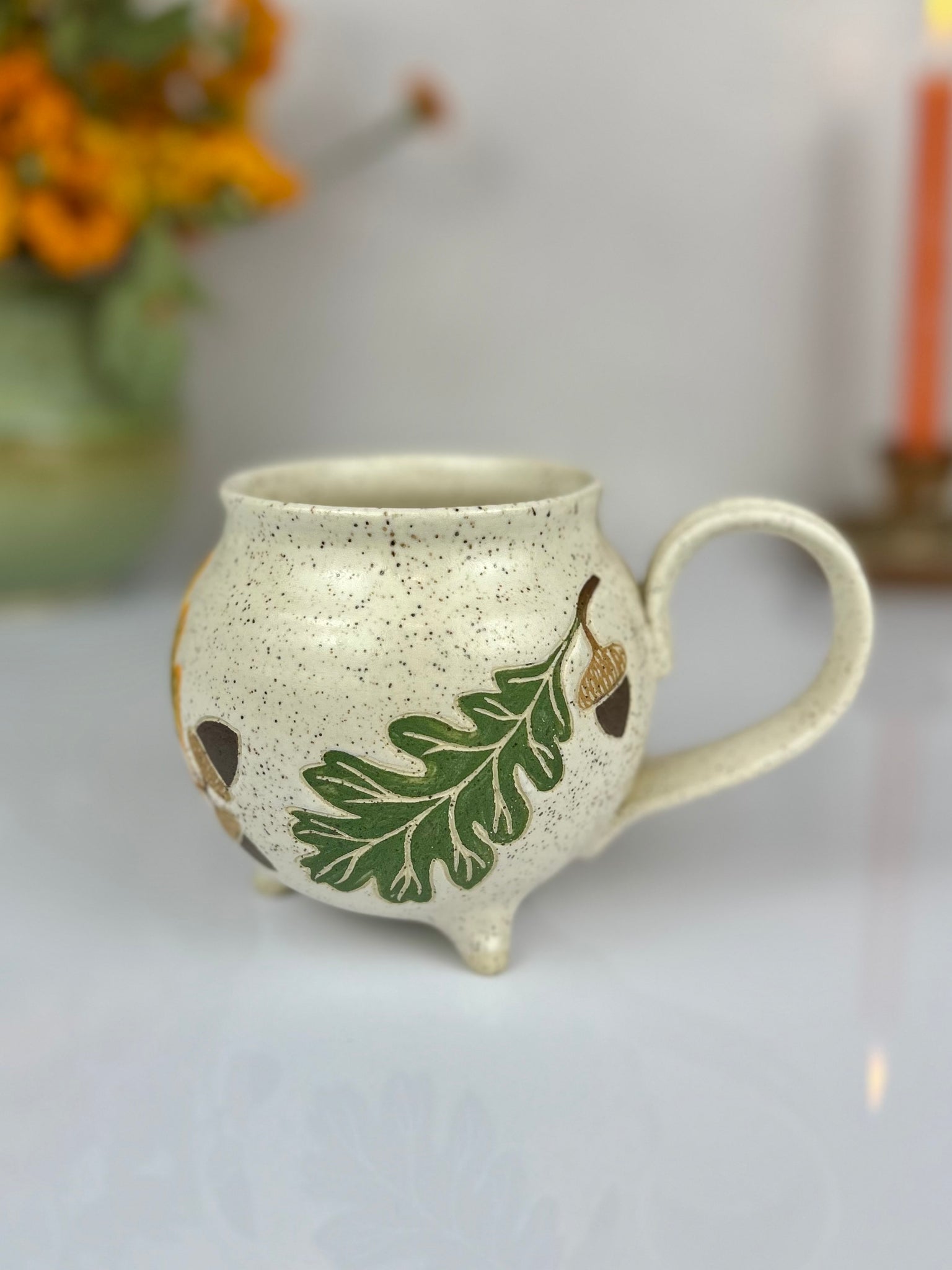 And thrown, painted, and carved Autumn oak and acorn cauldron mug made with speckled clay and glazed in white