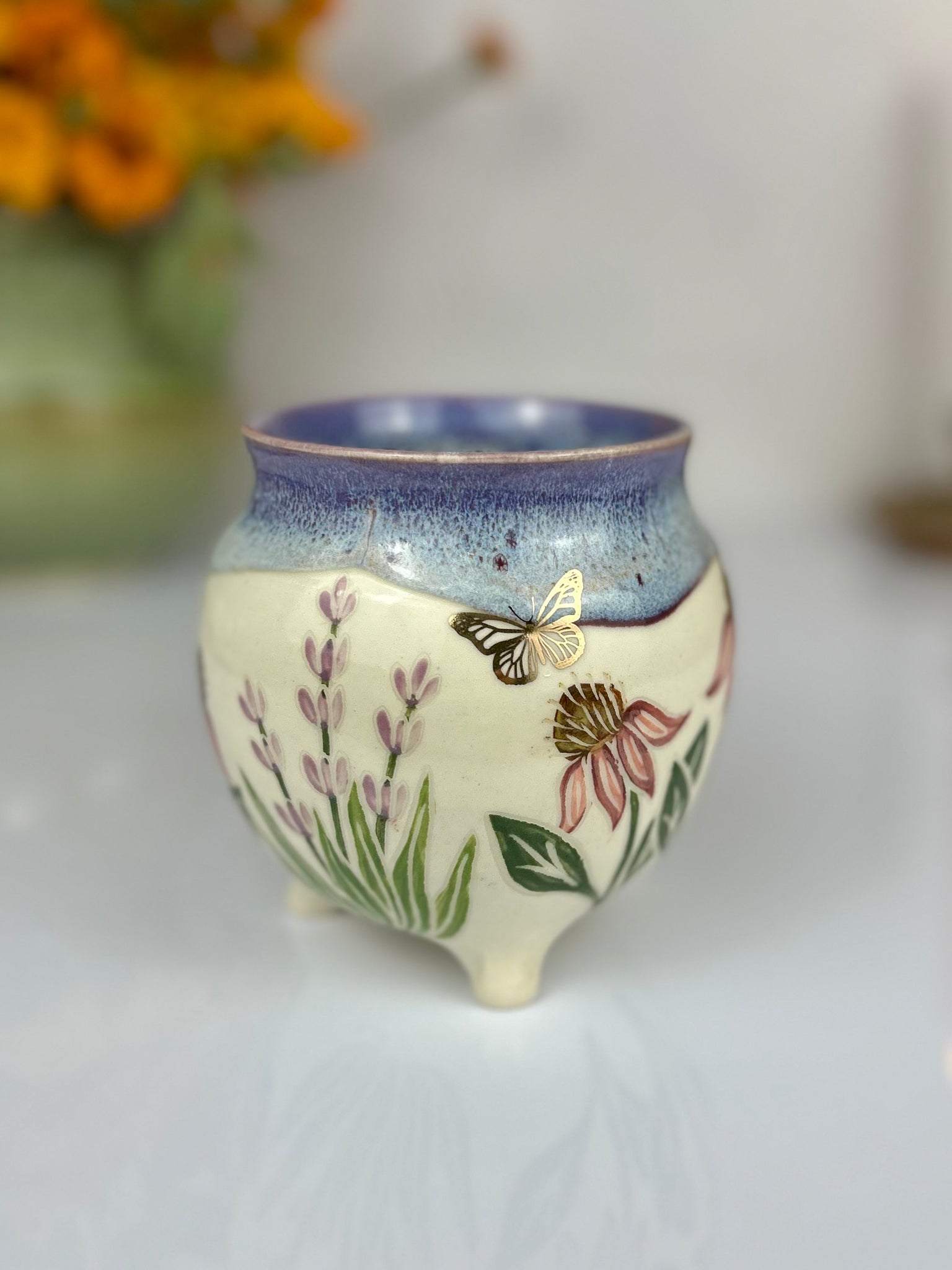 Hand thrown, painted, and carved Echinacea and lavender flower cauldron mug adorned with 22k gold butterfly decals.