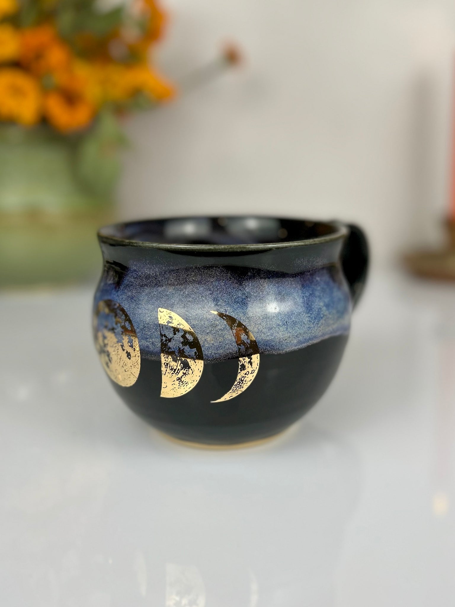 Hand thrown soup mug adorned with cosmic skies glaze and 22k gold moon phase decal.