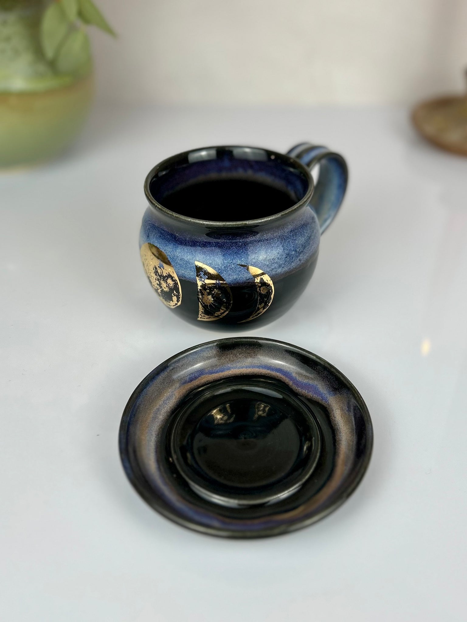 Hand thrown cappuccino mug adorned with cosmic skies glaze and 22k gold moon phase decal.