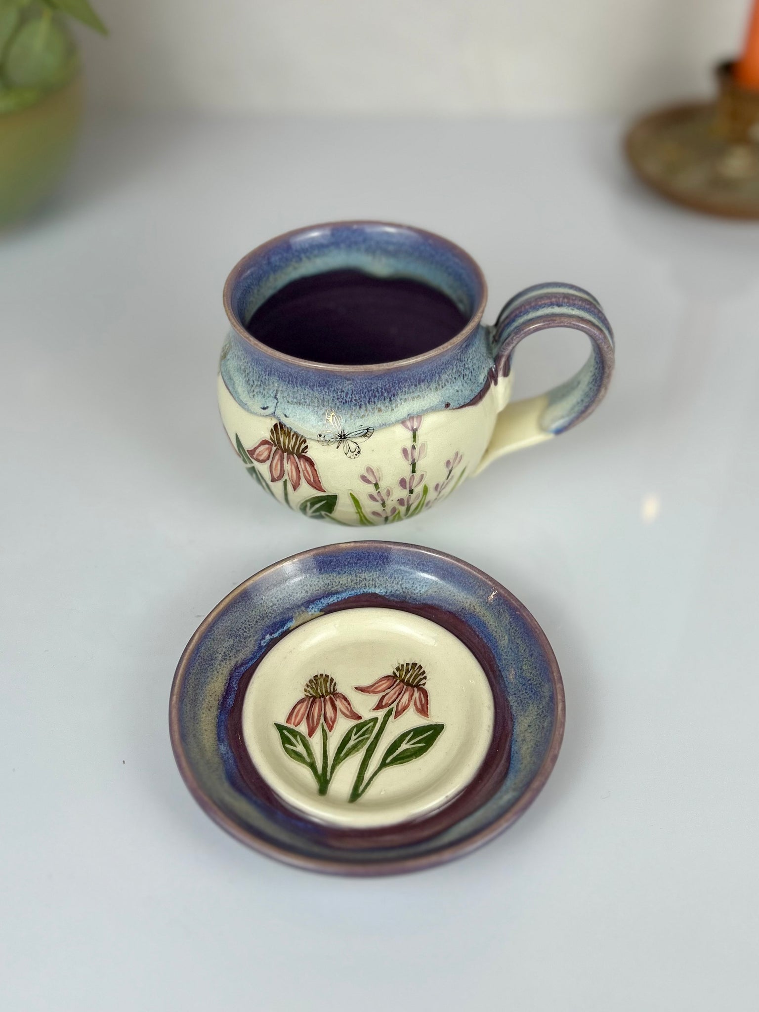 Hand thrown, painted, and carved echinacea and lavender flower cappuccino mug adorned with 22k gold butterfly decals and matching saucer plate.