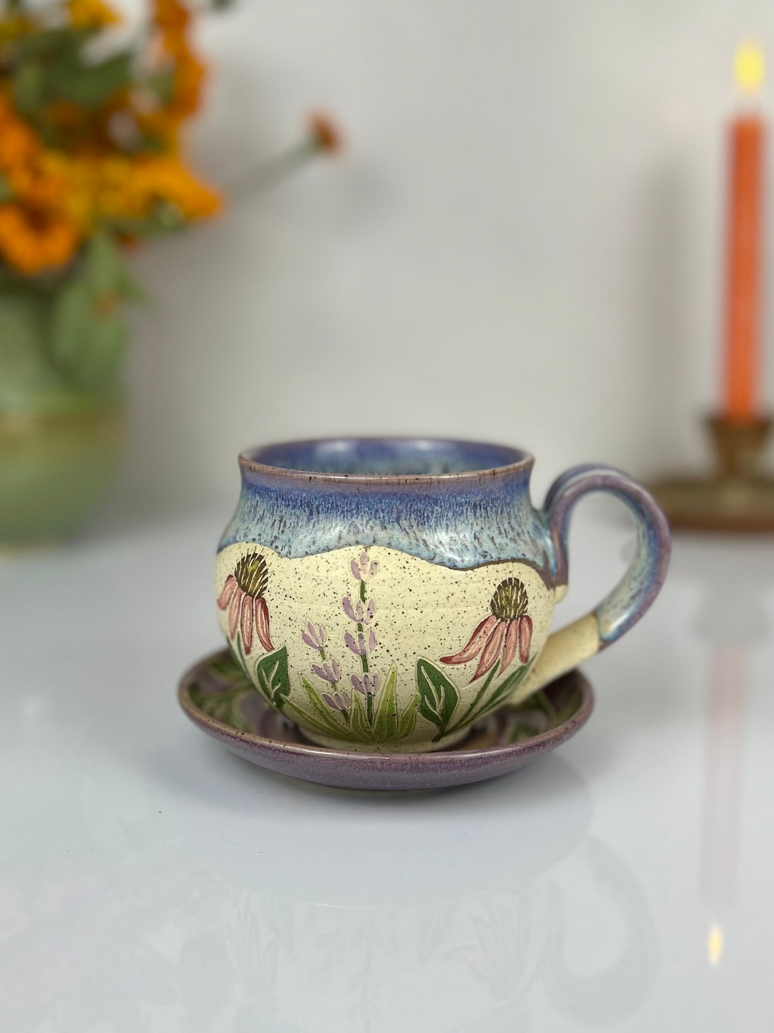 Hand thrown, painted, and carved Echinacea and lavender flower speckled cappuccino mug with matching vine plate